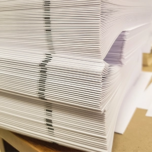 A stack of blank paper, book blocks prepared for binding in a printing house